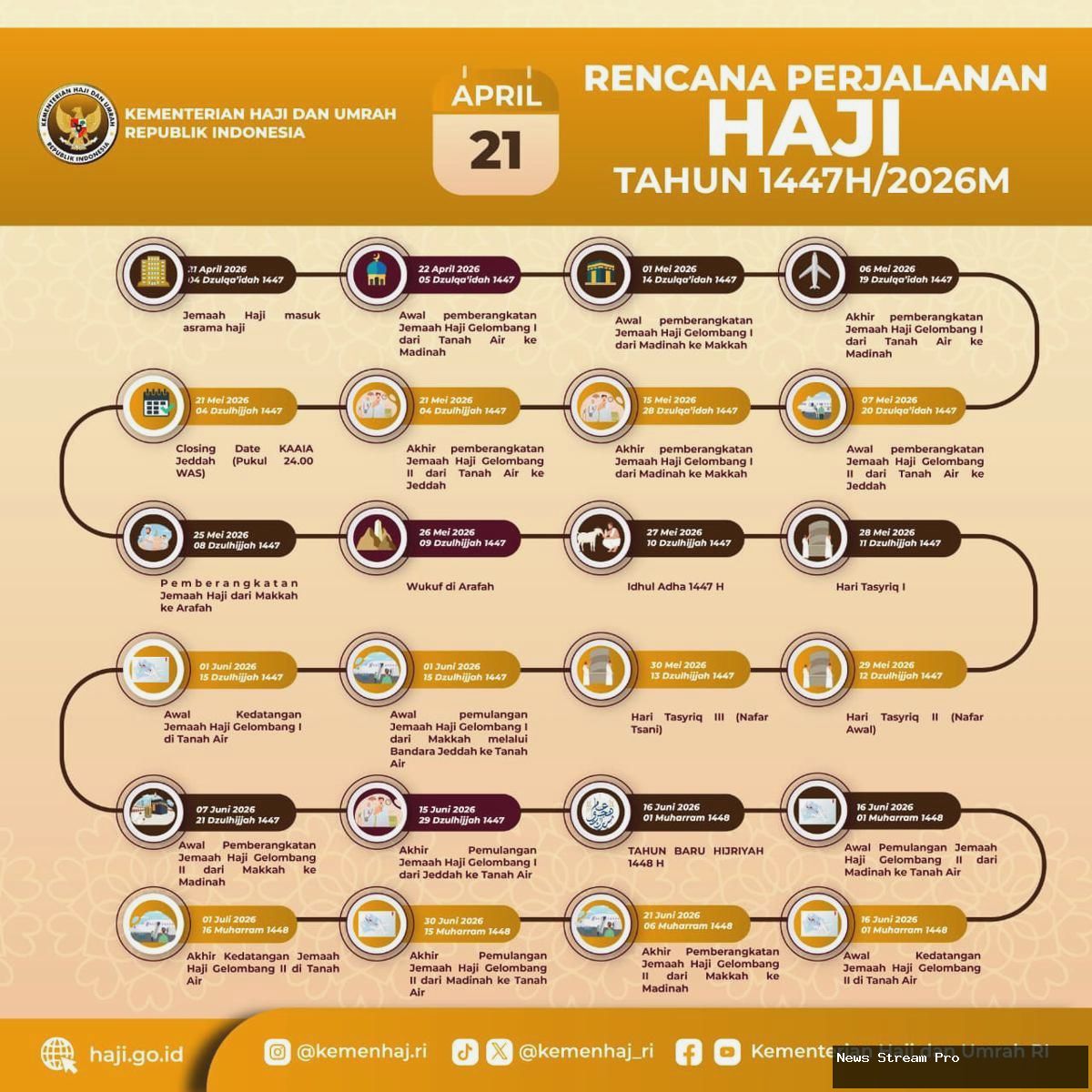 Puncak ibadah haji, yaitu wukuf di Arafah, dijadwalkan pada 26 Mei 2026. Jemaah haji kloter pertama gelombang pertama akan kembali ke Indonesia mulai 1 Juni 2026, dan fase pemulangan akan berlangsung hingga 1 Juli 2026. Kementerian berharap rencana ini menjadi pedoman bagi seluruh penyelenggaraan operasional haji.